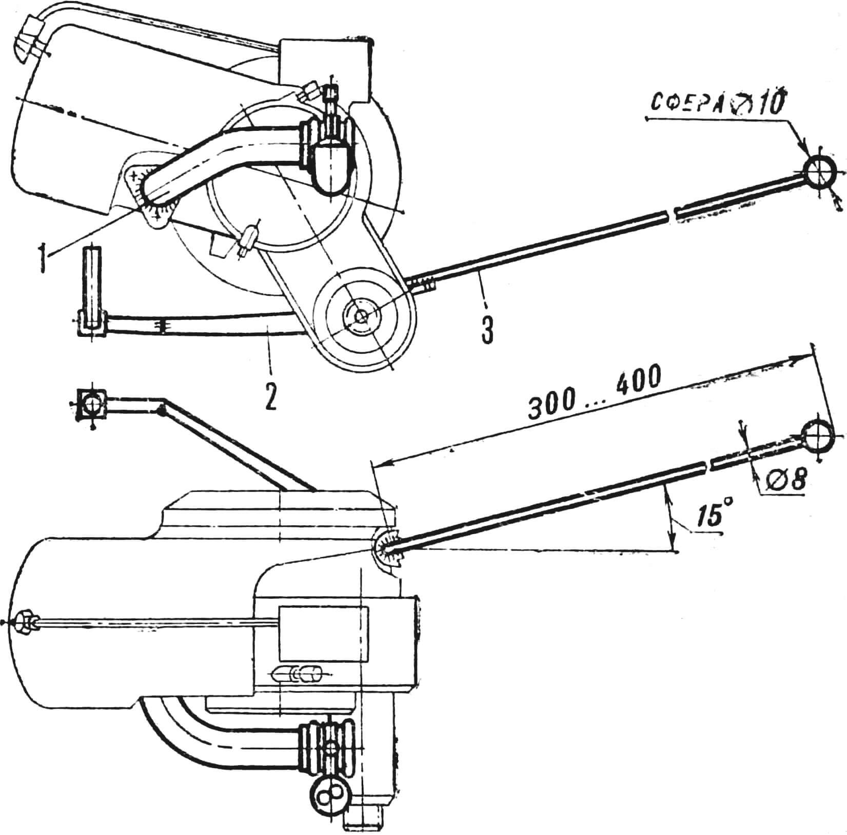 1 — труба карбюратора, 2 — рычаг кикстартера, 3 — рычаг переключения передач.