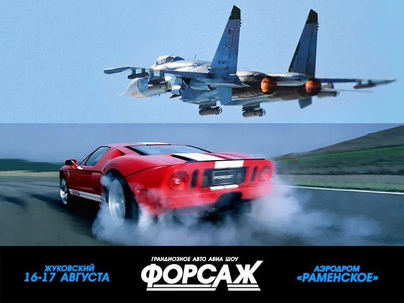 16-17 августа на аэродроме Раменское в городе Жуковский пройдет уникальное событие, у которого нет мировых аналогов: «Шоу Форсаж 2014». Мероприятие будет состоять из серии гонок на ускорение и на скорость между военными истребителями (МиГ-29, Су-30 и др.), и суперкарами (Ferrari, Bugatti, Lamborghini, Aston Martin и др.) на коротких, средних, и длинных дистанциях. Программу Шоу Форсаж дополнят исполнение фигур высшего пилотажа на боевых самолетах, демонстрационные выступления авто-и-мотоспортсменов, а также выступления авиационных пилотажных групп. В течение всего времени мероприятия будет действовать выставка уникальных и экзотических автомобилей, суперкаров и военной техники.
