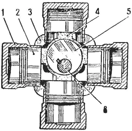 1 — цилиндр, 2 — поршень, 3 — кулачок, 4 — ролик, 5 — вращающееся основание цилиндров, 6 — впускной канал, 7 — пружина, 8 — золотниковый механизм.