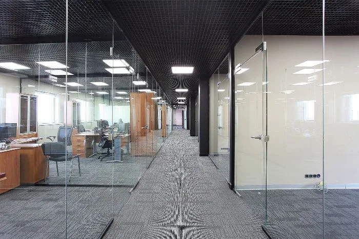 - Прозрачные глянцевые. Наиболее популярный и востребованный вариант. Недорогие, стильные, презентабельные. Позволяют зонировать пространство, при этом визуально сохраняя его открытость и простор. Прекрасно подходят для создания индивидуальных кабинетов и конференц-залов. Прозрачные перегородки позволяют начальнику ненавязчиво контролировать подчиненных и отслеживать их активность в течение дня. При необходимости дополняются белыми непрозрачными жалюзи, если время от времени требуется приватная обстановка.