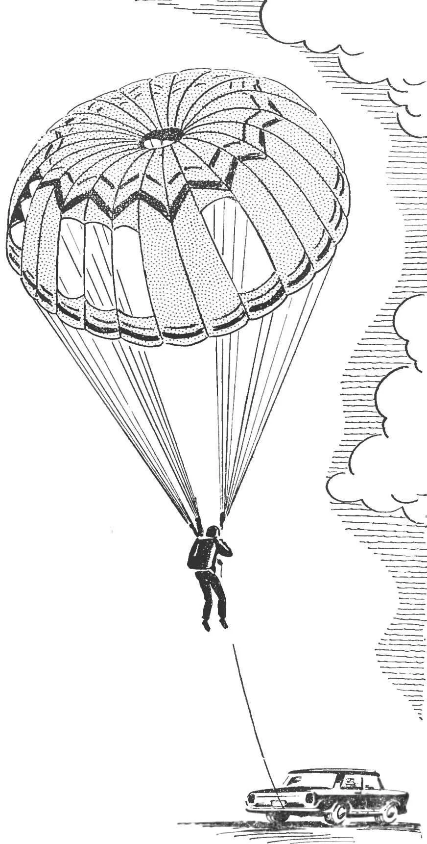 Полеты на парашюте с отцеплением от буксировочного фала являются полезным упражнением для отработки точности приземления. В чем здесь преимущества по сравнению с прыжками с самолета? Да в том, что выполнение прыжков этим способом занимает значительно меньше времени, чем обычно, поскольку оно не тратится ни на набор высоты, достаточной для безопасного раскрытия парашюта, ни на его укладку. Да и экономическая сторона дела немаловажна — «Волга» или «Жигули» — не самолет, им не нужны ни аэродром, ни взлетно-посадочная полоса, ни сотни литров горючего