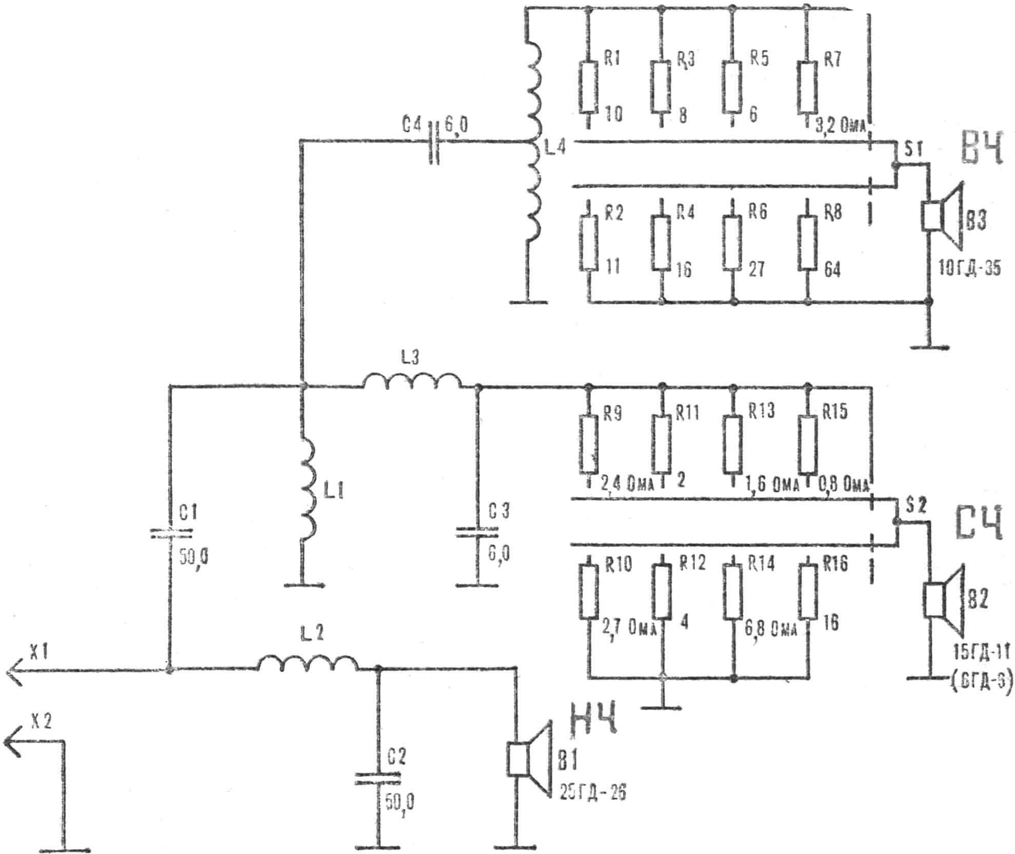 Громкоговоритель имеет фазоинвертор. Применен трехполосный разделительный фильтр с частотами раздела 520 и 4800 Гц (рис. 1). Наличие аттенюаторов позволяет регулировать АЧХ громкоговорителя в области средних и высших частот на ±4 дБ относительно среднего (нулевого) уровня. Резисторы аттенюаторов выполнены проводом ПЭМС 0,41—0,56. Их можно изготовить из спирали утюга или электроплитки.