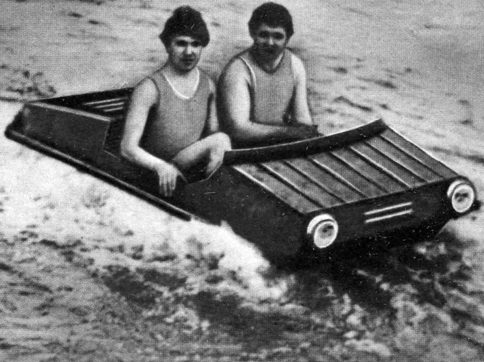 Автор этого письма — В. Портнов из д. Меликасы Чувашской АССР — поистине мастер на все руки. Судите сами. На его счету два мотоплуга, пять аэросаней, микротрактор, мотонарты, несколько станков для обработки дерева. И наконец, вездеход-амфибия, о котором и пойдет речь. Служит он свыше двух лет, отлично держится на плаву. Мотор и колеса от мотоколяски. Зимой амфибия оснащается гусеницами — получается вездеход высокой проходимости и надежности.