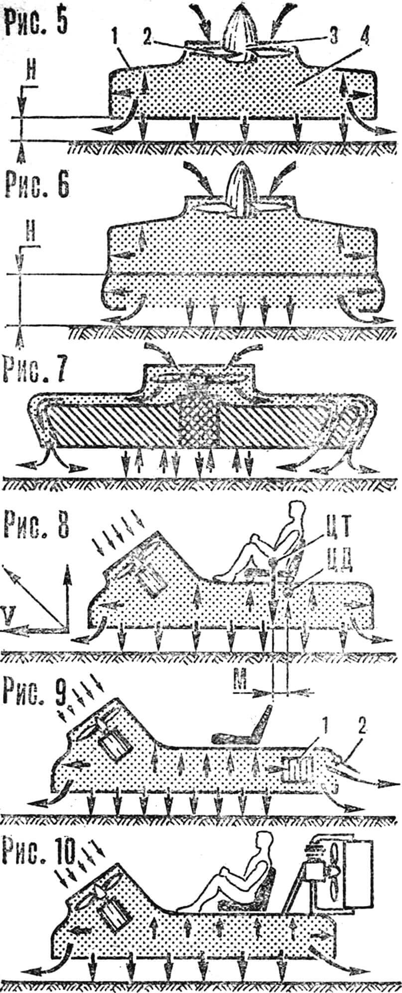 Проходимость такого аппарата, когда он двигается, невелика, так как жесткий низ не пропускает под себя неровности почвы. Проходимость увеличивают, устанавливая по периметру корпуса мягкое ограждение — юбку. Высота парения аппарата с юбкой при том же давлении значительнее (рис. 6). Это так называемая камерная схема, у которой один существенный недостаток — малая устойчивость. Аппарат такой конструкции чрезвычайно чувствителен к изменению центровки.