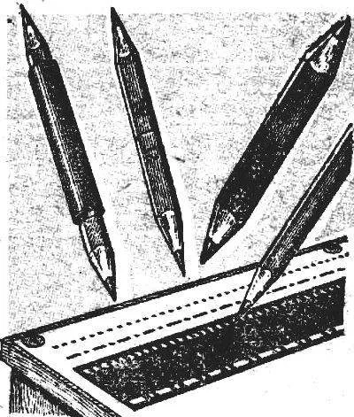 Коротким карандашом удобнее работать с помощью ручки-удлинителя из тонкостенной трубки. Но и в этом случае полностью использовать грифель не удается. Предлагаю приклеить «коротышку» торцом к другому карандашу. Соединение на ПВА будет достаточно прочным. Так же можно делать двухсторонние карандаши: разноцветные или с различной твердостью грифеля. Кусок фотопленки — отличный трафарет для чертежных работ: с его помощью можно одним движением карандаша провести пунктирную, а немного изменив перфорацию — штрих-пунктирную линию.