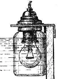 Большинство аквариумных рыб — теплолюбивые, поэтому даже вода комнатной температуры для них холодна, ее необходимо подогревать. Нуждаются они и в дополнительном освещении. «Убить сразу двух зайцев» позволит такое приспособление. На полиэтиленовую крышку стеклянной банки крепится патрон с пластмассовыми гайками для абажура и металлический кронштейн. Остается ввинтить матовую лампу мощностью 15 — 25 Вт, закрыть банку, вложить в вилку кронштейна резиновую прокладку, надеть получившийся фонарь на стенку аквариума: будет и свет и тепло.