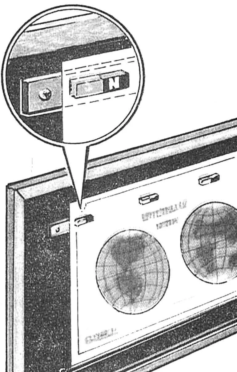 Недолог век канцелярской кнопки! Неосторожное движение или слишком твердая доска — и кнопка ломается или сгибается. Существует множество разнообразнейших конструкций держателей для плакатов и географических карт — начиная от простейших (например, дюжины привернутых к стене бельевых прищепок) и кончая достаточно сложными. Рекомендуем еще один способ фиксирования. Для этого потребуется стальная полоса толщиной 1 —1,5 мм и шириной 20—30 мм и десяток магнитов — например, от дверных магнитных защелок. Стальная полоса закрепляется шурупами в верхней части классной доски, а чтобы закрепить плакат, достаточно приложить его к полосе и прижать магнитом. Бумагу при этом надежно удержат магнитные силы-невидимки.