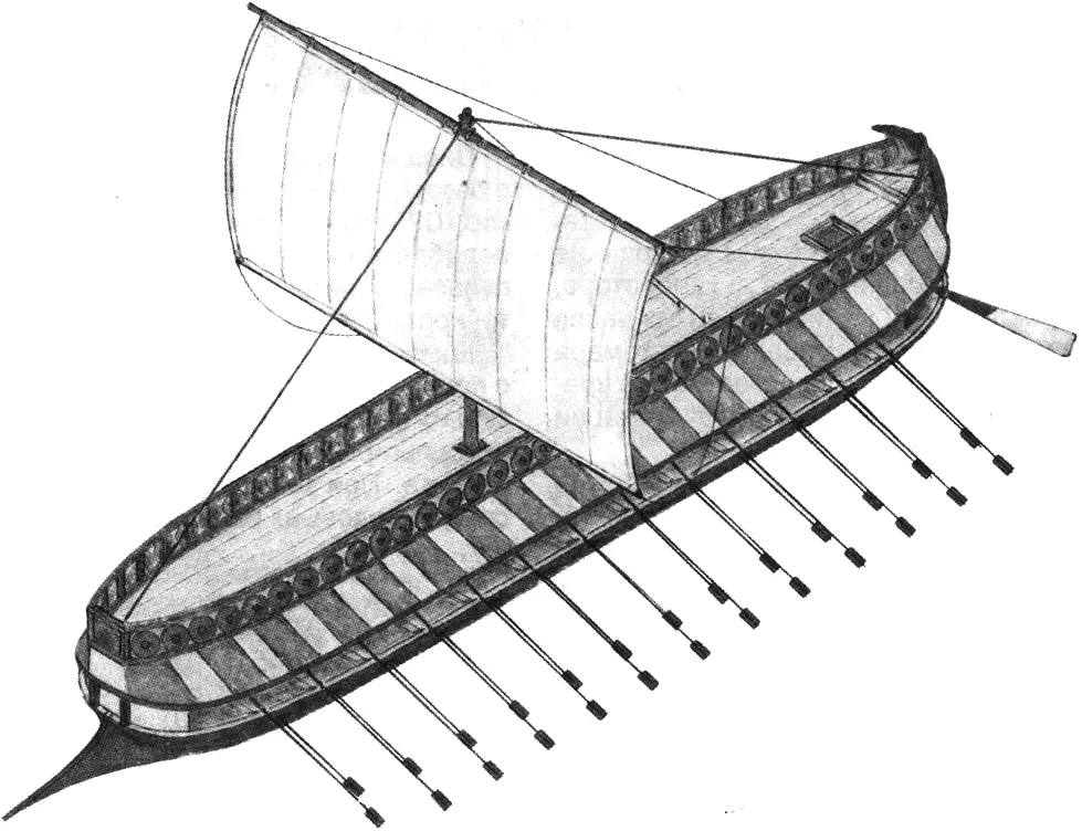 Решив проблему защиты экипажа, кораблестроители столкнулись с другой проблемой: более вместительные и тяжелые корабли потеряли в скорости. При этом резерв размещения дополнительных гребцов был исчерпан. Одними из первых выход из этой ситуации нашли финикийцы. Они удлинили рукояти весел и увеличили расстояние между банками -появилась возможность добавить еще по одной линии гребцов у борта. Уключины для их весел вынесли на специальный балкон.